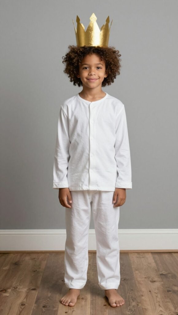 Let’s be real, this is basically just elevated pajamas. Find a white sleeper or sweatsuit. The key elements are a simple gold crown (hello, construction paper) and some DIY fuzzy ears and a tail.
