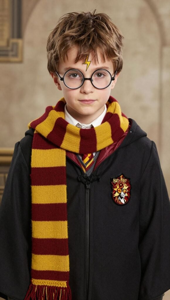 Honestly, who hasn’t got an old scarf lying around? A pair of round glasses (toy ones work great), a drawn-on lightning bolt scar with eyeliner, and a dark robe or even a simple black hoodie does the trick.