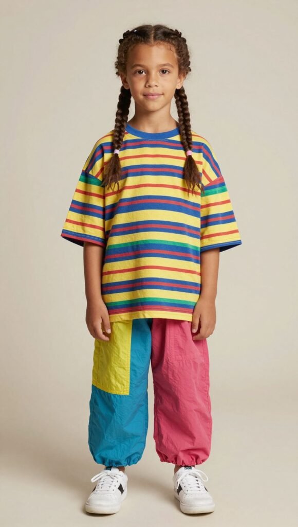 This is where mismatched rules. Think oversized, colorful clothes, maybe a striped shirt and a patched skirt or baggy pants. The real showstopper is the hair: two stiff braids sticking straight out.