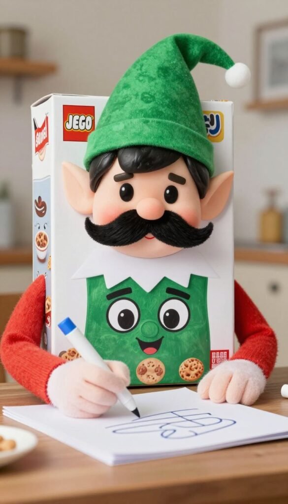 Who doesn’t love a good mustache on a cartoon character? Your elf clearly does. Have them draw silly faces or mustaches on the cereal box characters with a dry-erase marker.