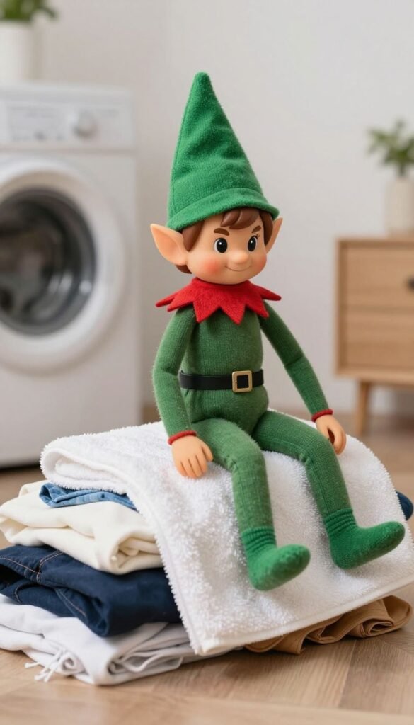 Even elves need clean clothes, or maybe they just like to play in them. Discover your elf nestled in a pile of clean laundry, perhaps “wearing” a sock as a hat or riding a clean towel like a magic carpet.