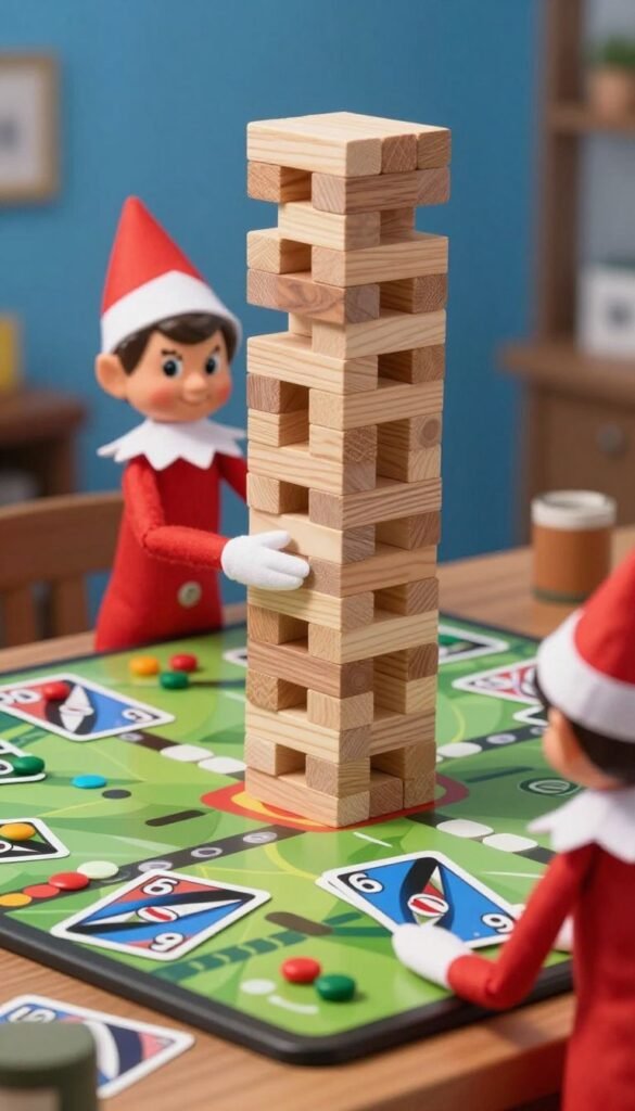 Your elf loves a good board game, but maybe plays by its own rules. Pose the elf mid-game, perhaps having ‘cheated’ in Uno by drawing a bunch of cards or stacking Jenga blocks impossibly high.