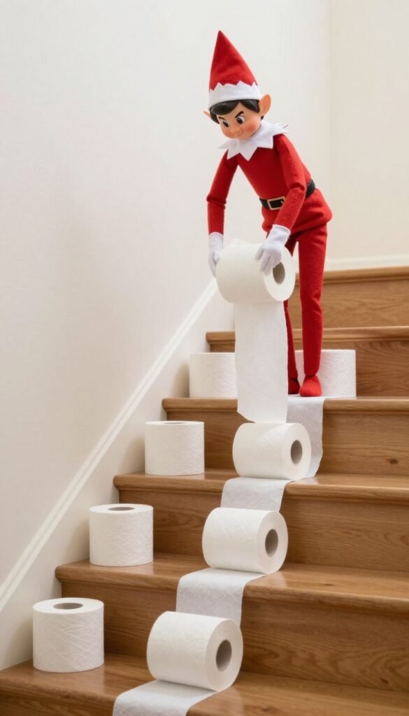 This is a classic prank, elevated. Have your elf tangled in a stream of toilet paper, perhaps having rolled it down the stairs or across a room.