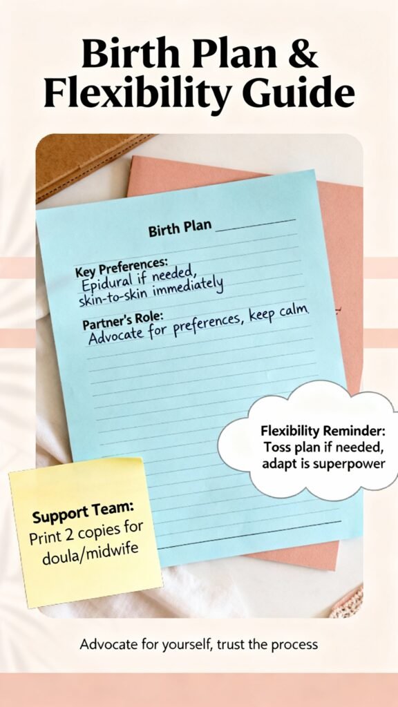 Don’t just wing it entirely. Even if it’s just a mental note, having some idea of what you want (or absolutely don’t want) helps you feel more in control. Share your preferences with your partner so they can advocate for you. Print a few copies of your birth plan notes for your support team, but also be ready to toss it out the window if things go sideways. Flexibility is your superpower here. It empowers you to advocate for yourself.