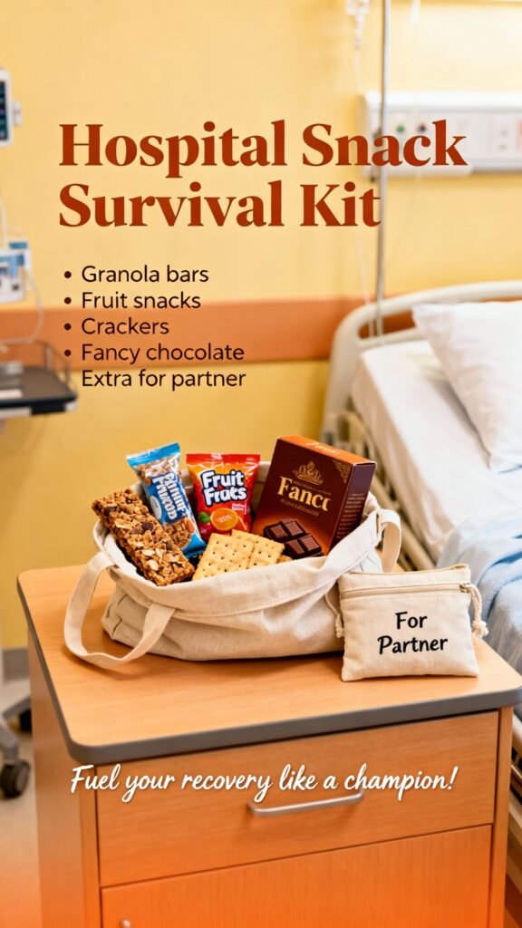 You’re going to be starving. Seriously. Hospital food is… hospital food. Pack your favorite non-perishable snacks like granola bars, fruit snacks, crackers, or maybe even some fancy chocolate. Pack extra for your partner too, because a hangry partner is not a helpful partner. Fuel your recovery like the champion you are.