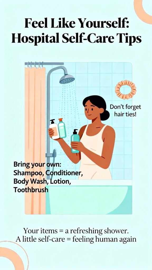 Feel less like a patient, more like yourself. Bring your own shampoo, conditioner, body wash, lotion, and toothbrush. The hospital stuff is fine, but yours is better for a truly refreshing shower. Don’t forget a hair tie or two; you’ll thank yourself later. A little self-care goes a long way in feeling human again.