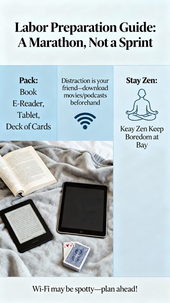 Labor can be a marathon, not a sprint. Pack a book, e-reader, tablet, or a deck of cards. There will be waiting, trust me, and distraction is your friend. Download movies or podcasts beforehand, just in case the Wi-Fi is spotty (it probably will be). Keep boredom at bay and stay zen.